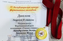 17 мая, фортепианный ансамбль "Вдохновение" в составе Заитовой Юлии и Загидуллиной Залии (кл.преп-ля Нигматзяновой А.Н, Гуськовой Н.В) отлично выступил и стал Лауреатом II степени в Республиканском конкурсе фортепианных ансамблей.