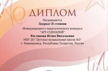19 ноября, преподаватель по классу вокала (хора) "Детской музыкальной школы №5" - Рослякова Юлия Витальевна приняла участие в Международном педагогическом конкурсе "Арт- сценарий" и стала Лауреатом II степени.