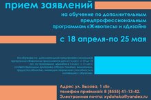Хотите научиться рисовать, лепить, конструировать? МАУ ДО "Детская художественная школа №1" НМР РТ ждёт вас! Только в ДХШ №1 ваши талантливые дети получат прочные знания, умения, навыки в области изобразительного искусства! На обучение по дополнительной предпрофессиональной программе «Живопись» принимаются дети в 1 класс с 10 до 12 лет, по программе «Дизайн» в 1 класс с 11 лет с соответствующими критериям отбора: памятью, вниманием, трудоспособностью, имеющие творческие способности и мотивацию к обучению. Количество вакантных мест на обучение в 2022-2023 уч.г. по программе «Живопись»-68, по программе «Дизайн»-33. Имеющиеся у ребенка знания, умения и навыки в возрасте 13-14 лет, приобретенные им за пределами нашей образовательной организации, а также наличие у него творческих и интеллектуальных способностей в соответствии с уровнем федеральных государственных требований позволяют ему поступать во 2 класс МАУ ДО «Детская художественная школа№1» НМР РТ, на общих основаниях. Срок подачи пакета документов с 18 апреля по 25 мая. Заявления подаются в приёмной школы. К заявлению на бумажном носителе прилагаются в скоросшивателе с прозрачной обложкой следующие документы в файлах: - форма заявления в приёмной; фото ребёнка 3*4 любого цвета (1 шт.); копия свидетельства о рождении ребёнка (или паспорта); копия ИНН, СНИЛС учащегося; копия свидетельства о регистрации учащегося по месту жительства (пребывания) форма №8; медицинская справка, подтверждающая возможность ребенка осваивать образовательные программы в области изобразительного искусства; медицинское заключение – для детей, которые имеют ограничения возможности здоровья (ОВЗ); академическая справка в случае перевода из другого образовательного учреждения, осуществляющего образовательную деятельность по образовательным программам соответствующего уровня и направленности. Дополнительный набор учащихся (при наличии вакантных мест) на освоение дополнительных предпрофессиональных программ состоится с 23 по 25 августа 2022г. Требования к уровню творческих способностей и физических данных поступающих в ДХШ№1: не должно быть физиологических препятствий для посещения групповых занятий; дети с ограниченными возможностями здоровья предоставляют специализированные справки и сдают экзамены на общих основаниях согласно локально-нормативному акту «Порядок, определяющий процедуру подготовки и проведения вступительных испытаний для поступающих на обучение по дополнительным предпрофессиональным программам в области искусств». 25 мая в 17.00 в галерее «Отражение» сбор вместе с родителями! 05.04.2022