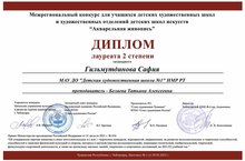 Подведены итоги Межрегионального конкурса для учащихся детских художественных школ и художественных отделений детских школ искусств «Акварельная живопись-2022». На первый этап (заочный) конкурса было подано более 400 заявок из 32 регионов РФ и двух стран - Республика Молдова и Республика Казахстан. Регионы - участники конкурса: 1.Алтайский край 2.Архангельская обл. 3.Астраханская обл. 4.Воронежская обл. 5.Калужская обл. 6.Кировская обл. 7.Костромская обл. 8.Краснодарский край 9.Красноярский край 10.Курская обл. 11.Липецкая обл. 12.Мурманская обл. 13.Пермский край 14.Республика Башкортостан 15.Республика Бурятия 16.Республика Коми 17. Республика Крым 18. Республика Мордовия 19. Республика Татарстан 20. Республика Хакасия 21. Рязанская обл. 22. Свердловская обл. 23. Смоленская обл. 24. Томская обл. 25. Тюменская обл. 26. Удмуртская обл. 27. Ульяновская обл. 28. Челябинская обл. 29. Чеченская Республика 30. Чувашская Республика 31. Ямало-ненецкий АО 32. Ярославская обл. Во второй этап (очный) прошел 221 учащийся детских художественных школ и художественных отделений детских школ искусств в возрасте от 12 до 17 лет. Очный этап конкурса проходил с использованием конференц-платформы ZOOM. Перед юными художниками была поставлена задача за 3 часа в режиме реального времени написать акварельный натюрморт с атрибутами народных художественных промыслов своего региона. Поздравляем с победой учащуюся нашей школы Гильмутдинову Сафию и её преподавателя Беляеву Татьяну Алексеевну с дипломом лауреата 2 степени. Молодцы, так держать! 18.04.2022