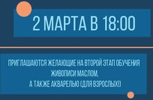 По многочисленным просьбам нижнекамцев! Стартует новый этап освоения техники живописи для взрослых! Приглашаем желающих освоить вторую ступень обучения живописи маслом, а также акварелью! Сбор 2 марта в 18 часов в ДХШ №1, по адресу: ул.Бызова, д.1-Б. Продолжительность курса - 2 месяца (по средам с 18:00 до 21:00). Обучение платное. Запись по телефону 89179378698. 25.02.2022