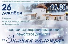 В Музее народного художника РТ А. Фатхутдинова состоялось открытие выставки работ преподавателей МАУ ДО «ДХШ №1» НМР РТ "Зимняя палитра"! На выставке, кроме живописных и графических работ двадцати двух педагогов, представлены декоративно- прикладное искусство, скульптура, русские народные костюмы. В каждом творении мастера ‐ будь то картина или миниатюрная статуэтка - мы видим красоту души, любовь к искусству, миру, людям. Добрые, тёплые слова в адрес преподавателей были сказаны родителями учащихся, художниками, гостями. Приглашаем жителей и гостей города соприкоснуться с прекрасным. Работа выставки продлится до 24 января. 29.12.2019