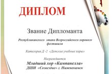 В фестивале принял участие младший хор ДШИ «Созвездие» - «КАМПАНЕЛЛА» (руководитель Круподёрова Е.Е., концертмейстер Гафурова Л.Т.). Достойно выступив на казанской сцене хор «Кампанелла» был оценен Званием Дипломанта. В число лучших хоровых коллективов республики вошел и данный детский коллектив.