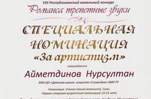 Учащийся ДШИ "Созвездие" Айметдинов Нурсултан (преподаватель, концертмейстер Биряльцева А.М.) награжден дипломом Специльной номинации "За артистизм" VIII Республиканского вокального конкурса "Романса трепетные звуки", который прошел 27 марта в ДХШ "Мечта".