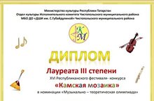 В конце 3 четверти в г.Чистополь состоялся XVI Республиканский фестиваль-конкурс "Камская мозаика". Призерами в номинации "Музыкально-теоретическая олимпиада " стали 11 воспитанников ДШИ "Созвездие".