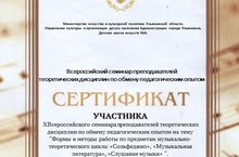 30 ноября 2022 г. состоялся X Всероссийский семинар преподавателей теоретических дисциплин по обмену педагогическим опытом на тему «Формы и методы работы по предметам музыкально-теоретического цикла: «Сольфеджио», «Музыкальная литература», «Слушание музыки», организатором которого выступила Детская школа искусств № 6 г. Ульяновска. Семинар проходил онлайн на платформе «True Conf». В работе семинара приняли участие преподаватели из Москвы, Санкт-Петербурга, Тольятти, Ульяновска, Сызрани, Нижнекамска.