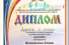19 марта учащиеся преподавателя Ченгаевой Т.В. Санжапова Зарина и Исмагилова Амина, а также воспитанница преподавателя Шигаповой Э.И. Гузаева Сабина стали Лауреатами III степени в Региональном конкурсе пианистов на лучшее исполнение этюда "ALLEGRO", который состоялся в ДМШ №1 г. Нижнекамска.