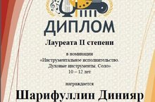Учащийся класса преподавателя Рассказчиковой Т.А. (концертмейстер Гузаева Л.В.) Шарифуллин Динияр (флейта) стал Лауреатом II степени, ансамбль народных инструментов "Карусель" - Лауреатом I степени, фортепианный дуэт Ченгаева Т.В., Гузаева Л.В. - Лауреатом II степени.