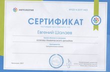 Е.В. Шалаев получил ценные знания и практические умения от лучших экспертов Рунета в области графического дизайна. В процессе обучения были сделаны максимальные акценты на изучение основ композиции и стиля в графическом дизайне, брендинга, теории цвета и колористики, шрифта и типографики, цифровой эстетики.