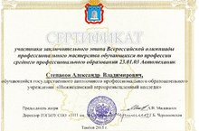 Студент 3 курса ГАПОУ «Нижнекамский агропромышленный колледж» Александр Степанов участвовал вне конкурса в заключительном этапе Всероссийской олимпиады профессионального мастерства обучающихся по профессии среднего профессионального образования 23.01.03 Автомеханик в г.Тамбове. Александр легко выполнил все конкурсные задания, сравнил свое мастерство с мастерством других молодых автомехаников России.