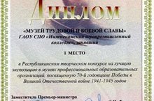 «Музей трудовой и боевой славы» ГАПОУ «Нижнекамский агропромышленный колледж занял достойное 1 место среди всех заявленных участников! Это достойная победа заявленной конкурсной работы авторского коллектива Е.В.Шалаева, С.В.Титова, Р.И. Байкиной под руководством директора А.К.Кадырова. Кропотливая работа в создании, разработке музейных экспозиций была проделана Р.Р.Зелалетдиновой, Р.Р.Мухамадиевой, В.И.Мухтаровым.