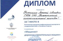 13 апреля 2015 года в Казани завершился региональный чемпионат профессионального мастерства по стандартам WorldSkills в Республике Татарстан по компетенции «Машинист дорожно-строительных машин». Данное направление подготовки – одно из важных в ГАПОУ «Нижнекамский агропромышленный колледж». Студент колледжа Никишин Алексей легко и правильно справился с конкурсными заданиями и достойно занял 1 место. Руководитель Алексея – мастер производственного обучения – Яруллин Ильнар Ильшатович.