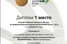 В очередной раз студент ГАОУ СПО «Нижнекамский агропромышленный колледж» Казаньков Андрей завоевал 1 место в рамках Второго Открытого чемпионата Москвы WorldSkills Russia-2013 по компетенции «Автомеханика» среди студентов образовательных учреждений профессионального образования РФ, который проходил в 1-4 ноября 2013 года в г.Москве. Андрей представлял автомехаников от Республики Татарстан. -