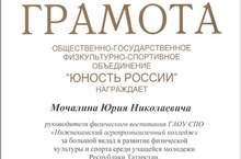 За большой вклад в развитие физической культуры и спорта среди учащейся молодежи Республики Татарстан руководитель физического воспитания ГАОУ СПО «Нижнекамский агропромышленный колледж» Мочалин Юрий Николаевич награжден Почетной грамотой общественно-государственного физкультурно-спортивного объединения «Юность России». Поздравляем нашего коллегу, желаем дальнейших творческих успехов!