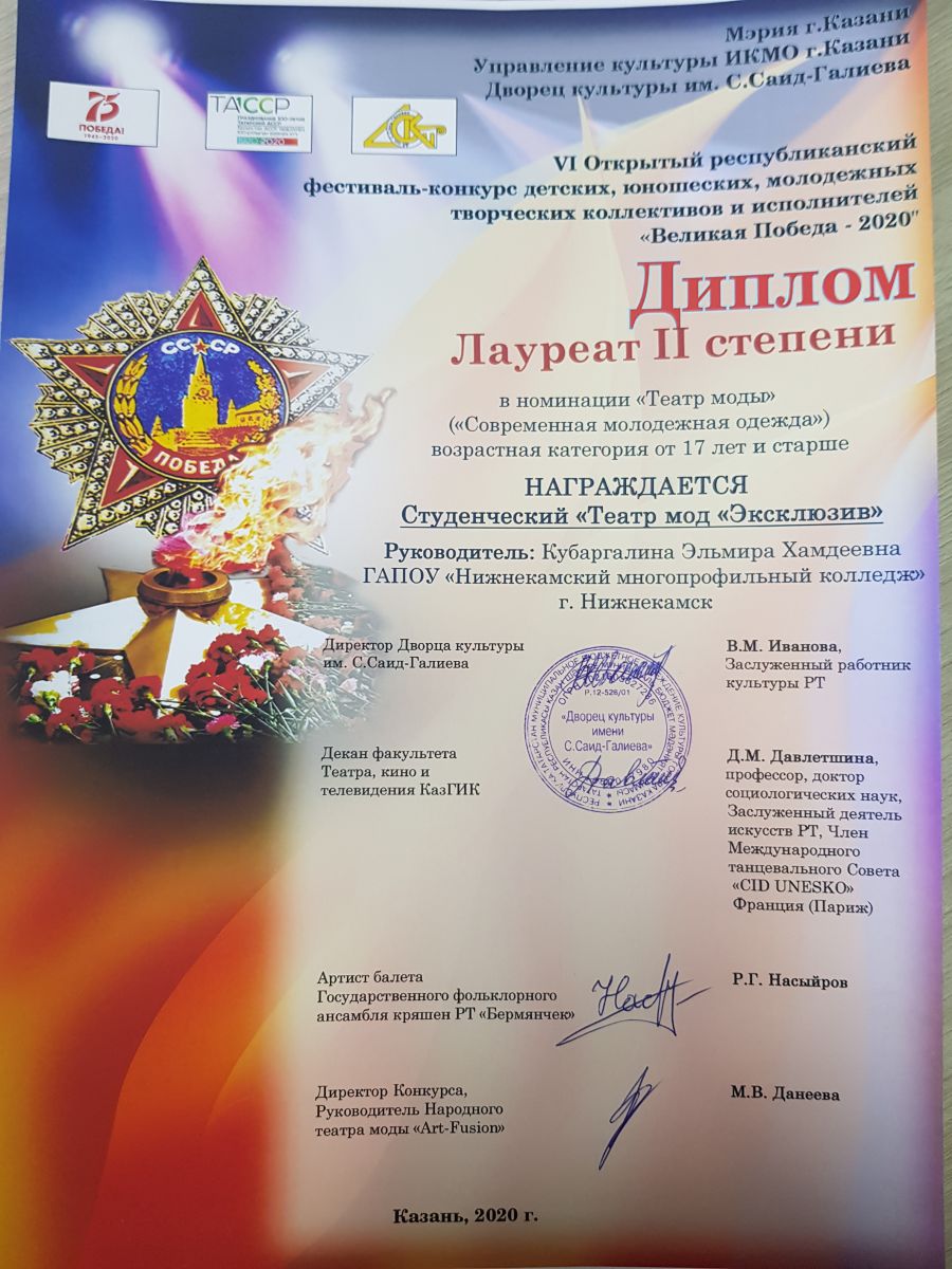 В Нижнекамском многопрофильном колледже обучается очень много талантливых студентов! И среди них есть студенческий театр мод «Эксклюзив», который 6 декабря принял участие в VI Открытом Республиканском фестивале-конкурсе детских, юношеских, молодежных творческих коллективов и исполнителей «Великая Победа». Фестиваль-конкурс прошел в г. Казань во дворце культуры им.С. Саид-Галеева.
