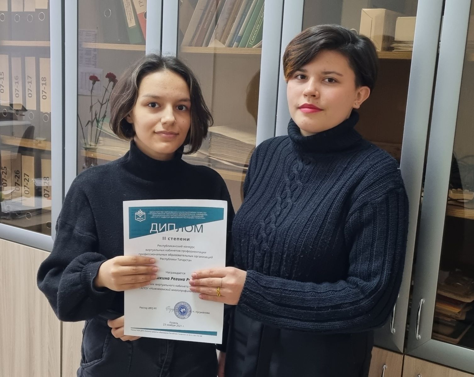 Опубликовано: 04.12.2021ДИПЛОМ ll степени Республиканского конкурса кабинетов профориентации профессиональных образовательных организаций РТ награждаются Нуртдинова Алия Мусамировна,