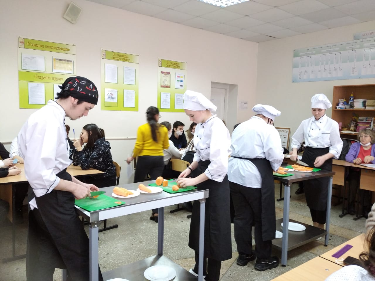 Опубликовано: 28.01.2022В рамках профессиональной декады группы технологов 12 и 13 участвовали в конкурсе профмастерства, где определился победитель-лучший по нарезке овощей Азиз Валеев. Так же ребята познакомились со сложными формами нарезки. Были продемонстрированы приёмы по изготовлению украшений из овощей и фруктов.