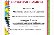 Поздравляем Маклакову Диану обучающуюся Нижнекамского индустриального техникума по профессии "Оператор информационных систем и ресурсов" с Победой в Республиканском студенческом конкурсе исследовательских работ и проектов с применением математических методов, посвященном Дню Российской науки. Научный руководитель Газизова Зиля Узбековна преподаватель математики.