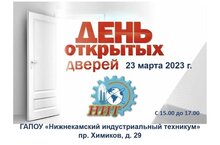 23 марта 2023 года с 15.00 до 17.00 в ГАПОУ "Нижнекамский индустриальный техникум" состоится ДЕНЬ ОТКРЫТЫХ ДВЕРЕЙ