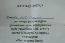 1 июня прошло физкультурно-развлекательное мероприятие среди студентов СПО и ВУЗ, квест "С юмором по жизни!", посвященное Дню защиты детей. Команда студентов Нижнекамского индустриального техникума награждена дипломом ПОБЕДИТЕЛЯ.