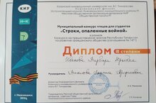 Студентка ГАПОУ Нижнекамский политехнический колледж имени Е.Н.Королёва Иванова Варвара стала Дипломантом третьей степени муниципального конкурса чтецов для студентов "Строки, опалённые войной".