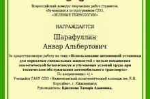 Студент 3 курса Шарафуллин Анвар стал участником Всероссийского Конкурса «Зеленые технологи». Его конкурсная работа на тему: «Использование автономной установки для перекачки специальных жидкостей с целью повышения экологической безопасности и улучшения условий труда при техническом обслуживании автомобильного транспорта» по результатам оценки экспертной комиссии заняла призовое место.