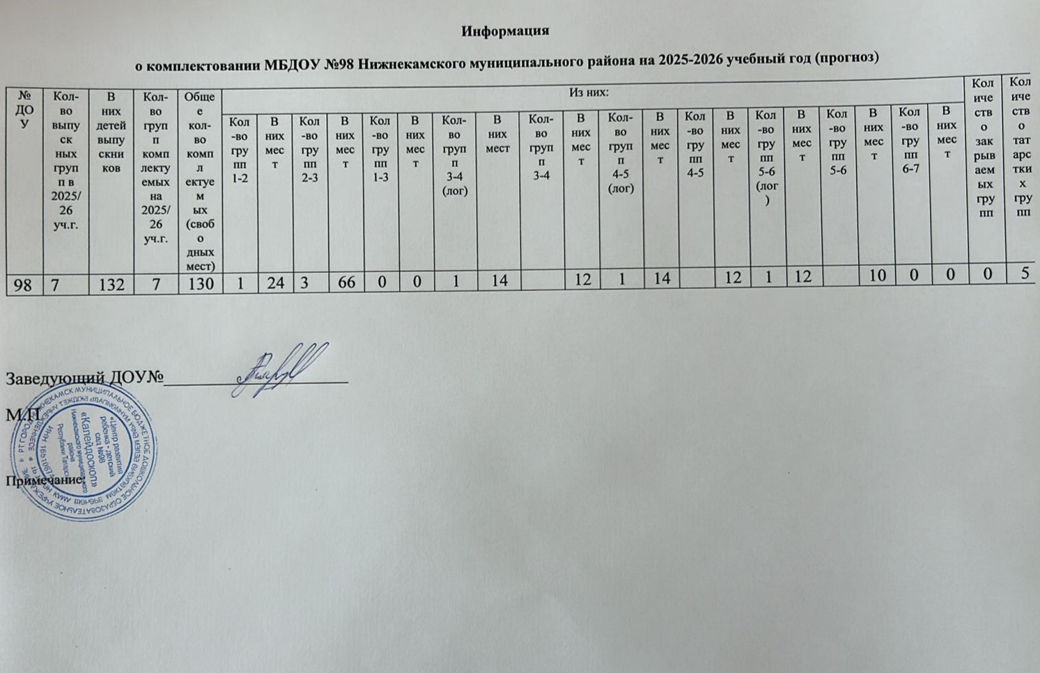 Сведения о количестве мест в разных возрастных группах на лето 2025 года: МБДОУ №98 НМР РТ
