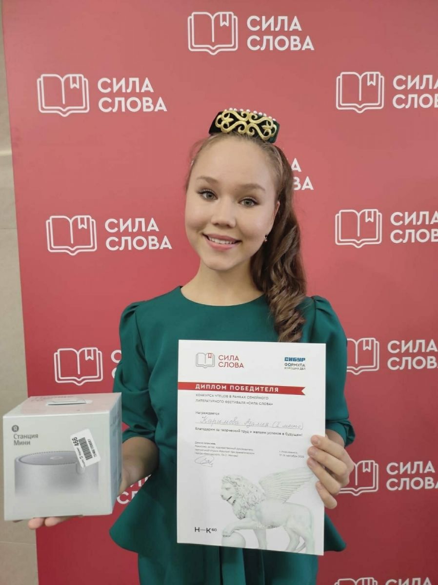 Сегодня в ДНТ прошел финал литературного фестиваля - конкурса "Сила слова", при поддержке компании "Сибур". Ученица 7Б класса Азалия Каримова стала победителем конкурса и обладателем главного приза - умная колонка Яндекс-станция, дипломом победителя.