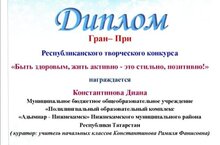 "Сәламәт булу, актив яшәү-бу мөһим!" Республика иҗат конкурсына йомгак ясалды.". 2 А сыйныфы укучысы Константинова Диана "Иң яхшы рәсем, плакат" номинациясендә Гран – При дипломына ия булды. Котлыйбыз сине, Диана! Тагын да зуррак уңышларга ирешүеңне теләп калабыз.