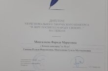 Ученица 3А класса Мингалиева Фарида участвовала в VII региональном творческом конкурсе "Я лиру посвятил народу своему…" и награждена дипломом III степени (руководители Ганиева Р.Ф., Мингалиева Г.М.) -