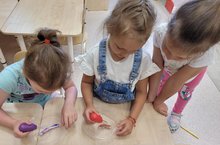 Ребята узнали, что природный песок – это рыхлая смесь твердых песчинок размером 0,10—5 мм, образовавшаяся в результате разрушения твёрдых горных пород. Между песчинками в сухом песке находится воздух, а в мокром песке – вода. Вода склеивает песчинки. Именно поэтому сухой песок можно пересыпать, а мокрый – нет, зато из мокрого песка можно лепить разнообразные фигуры. По этой же причине в сухой песок предметы погружаются глубже, чем в мокрый.