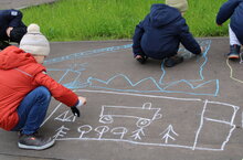 По окончанию квеста воспитанники отправились на улицу, где вооружившись разноцветными мелкими рисовали опасные ситуации и отважных пожарных, которые готовы прийти на помощь.