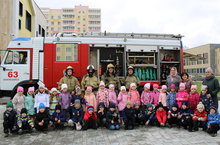 К радости детей и взрослых в наш детский сад приехала пожарная машина. Представители пожарной части №63 провели подробную экскурсию для ребят: показал все части спасательной машины, рассказал о назначении ее частей и оборудования. Сотрудники пожарно-спасательной части продемонстрировали специальную пожарную технику и пожарно-спасательный инвентарь, показали предметы боевой одежды. Ребята с удовольствием примеряли шлем и даже панорамную маску, которую применяют при спасении пострадавших на пожаре. Воспитанники узнали много интересного: для чего пожарным специальный костюм, с помощью чего пожарные дышат в задымленных участках, чем укомплектована машина, какими средствами пожарные пользуются при тушении пожара. Ребята с интересом рассматривали и слушали рассказ гостей.