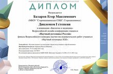 Поздравляем нашего воспитанника Базарова Егора, (педагог Баранова Н.И.), занявшего 1 место во Всероссийской онлайн-конференции учащихся "Научный потенциал России" в финале Всероссийского конкурса научно - исследовательских работ учащихся "Научный потенциал - XXI".Желаем дальнейших успехов и новых побед! -