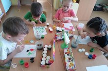 На лист наливается чуть-чуть краски, и дети дуют на капли, управляя их движением.