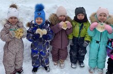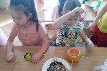 В детском саду ребята рассказали друг другу о своих кормушках, сделанных дома с родителями, и мы в группе все вместе изготовили разные съедобные кормушки для птиц. Осталось их развесить на участках детского сада и наблюдать какие птицы какое угощение больше любят. -