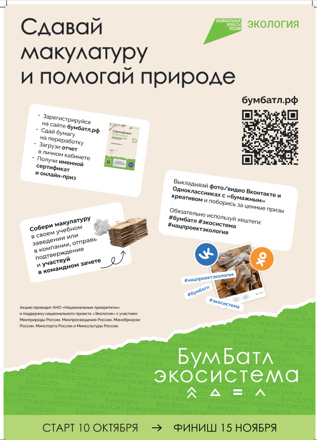 С 10 октября по 15 ноября по всей стране пройдет масштабная акция по сбору макулатуры #БумБатл! «Бумажная» битва проводится с целью обратить внимание жителей на важность сортировки отходов, а также продвижения экологичного образа жизни в целом.