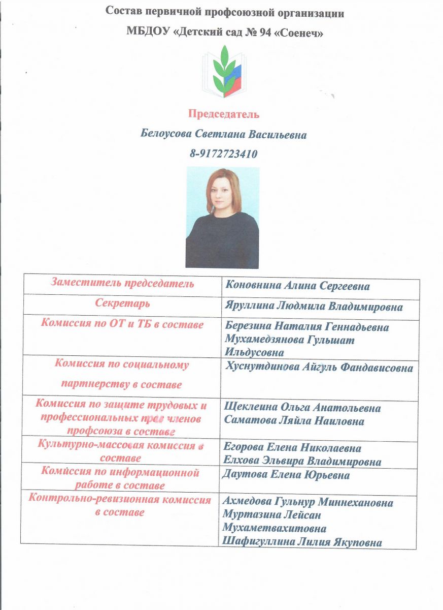Председатель первичной профсоюзной организации - Белоусова Светлана Васильевна, телефон: +79172723410, электронная почта: radost-94nk@mail