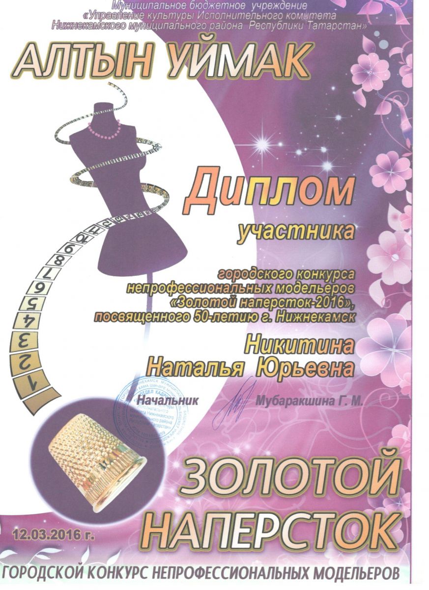 12.03.2016г. в ДК "Альфа" прошёл городской конкурс непрофессиональных модельеров "Золотой напёрсток-2016", посвящённый 50-летию г. Нижнекамска. Диплом участника был вручён  кастелянше МБДОУ №94 "Соенеч", Никитиной Наталье Юрьевне.