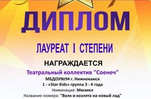 Театральный коллектив "Соенеч", художественным руководителем которого является Щеклеина Ольга Анатольевна, в очередной раз стал лауреатом I степени в Международном конкурсе детского, юношеского и взрослого творчества. Детский коллектив выступил с постановкой мюзикла "Волк и козлята на новый лад". Благодарственными письмами наградили Щеклеину О. А, музыкального руководителя Елхову Э. В., воспитателя по хореографии Муртазину Л. В., авторов сценария Яруллину Н. М., Ахметову А. Р.