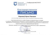 За активную деятельность в работе базовых экспериментальных площадок по проблеме "Образовательные возможности легоконструирования и робототехники в дошкольном образовании", за инициативность, творчество, большой вклад в распространение инновационного педагогического опыта в образовательную практику Благодарственное письмо от Казанского федерального универститета за подписью заместителя директора Елабужского института КФУ Р.Р.Ибатуллина награждена Маркова Ирина Павловна, воспитатель подготовительной к школе группы №11. Поздравляем педагога и желаем дальнейших успехов!