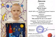 Поздравляем Юртова Андрея, воспитанника группы № 10 с дипломом I степени во Всероссийком конкурсе посвященного Дню космонавтики "Вселенная! О, как ты велика!", в номинации: "Мы звездный путь проложим".