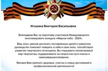 Поздравляем победителей IV Международного многожанрового конкурса «Мирное небо - 2024», посвященного 79 ГОДОВЩИНЕ ВЕЛИКОЙ ПОБЕДЫ 1945 Г. Дуэт: Кашипова Камиля, Сираева Айлин . Девочки стали Лауреатами 2 степени. Благодарнным письмом отмечена Игошина Виктория Васильевна за подготовку участников Мы поздравляем победителей Муниципального конкурса "САЛЮТ, ПОБЕДА!", посвященного 79-ОЙ ГОДОВЩИНЕ ПОБЕДЫ В ВЕЛИКОЙ ОТЕЧЕСТВЕННОЙ ВОЙНЕ 1941-1945 гг. ДИПЛОМ Лауреата | степени в номинации «Разукрасим мир стихами» награждена Сираева Айлин,педагог Игошина Виктория Васильевна. Лауреата || степени в номинации «Разукрасим мир стихами» награждена Табакина Виктория, преподаватель Игошина Виктория Васильевна. Восхищаемся и аплодируем!