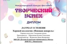 ДИПЛОМ ЛАУРЕАТ І СТЕПЕНИ Хоровой коллектив «Поющая акварель»(Преподаватель - Абросимова Ксения Алексеевна, Концертмейстер - Журавлева Диана Валерьевна) ,