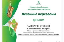 От души поздравляем Коробейникову Валерию И ее преподавателя по фортепиано Коробейникову Ольгу Николаевнау с победой во Всероссийском конкурсе инструментального искусства «Весенние перезвоны», она получила ДИПЛОМ ЛАУРЕАТА ІІI СТЕПЕНИ