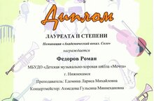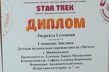 Поздравляем Самикову Авелину и ее преподавателя Едомину Ларису Михайловну с победой в конкурсе "Star Trek", Эвелина стала Лауреатом 1 степени, а также победителей в этом же конкурсе: Шумилову Марию(класс преподавателя по фортепиано Ахмедова Г.М).-Лауреат 3 степени, Сафиуллину Марину-лауреат 3 степени, Лукошину Евгению -Лауреат 2 степени(У обеих девочек преподаватель по вокалу Ахмедова Г.М.)