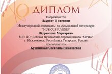 Диплом Лауреата II степени в Международной олимпиаде по музыкальной литературе "MUSICUS IUVENIS" удостоена Журавлева Маргарита(преподаватель Кушинская Светлана Николаевна) От души поздравляем и восхищаемся!