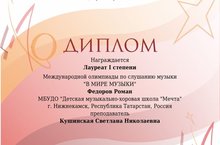 Радуемся успехам своих воспитанников. Международная олимпиада по слушанию музыки «В мире музыки» Лауреат I степени-Федоров Роман, преподаватель Кушинская Светлана Николаевна Благодарственным письмом отмечена преподаватель Кушинская С.Н. за прекрасную подготовку воспитанника Молодцы! Гордимся!