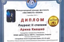 Поздравляем Кияшко Арину, ставшую Лауреатом II степени в Международном конкурсе- фестивале « Мы вместе», преподаватель Саперова О.М.