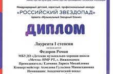 От души поздравляем Федорова Романа, он стал Лауреатом I степени в Международном конкурсе «Российский звездопад», проекта «Музыкальный звездный Олимп», так же награждены благодарственными письмами Едомина Лариса Михайловна, преподаватель вокала у Романа, концертмейстер Ахмедова Г. М., От души поздравляем Святову Ксению , она стала Лауреатом I степени, от души поздравляем Илалову Софию , она стала Лауреатом III степени От души поздравляем Шапореву Софью она стала Лауреатом II степени, преподаватель у девочек Саперова Ольга Михайловна , концертмейстер Сафина А. Н.также преподаватель и концертмейстер отмечены благодарственными письмами,поздравляем и радуемся!